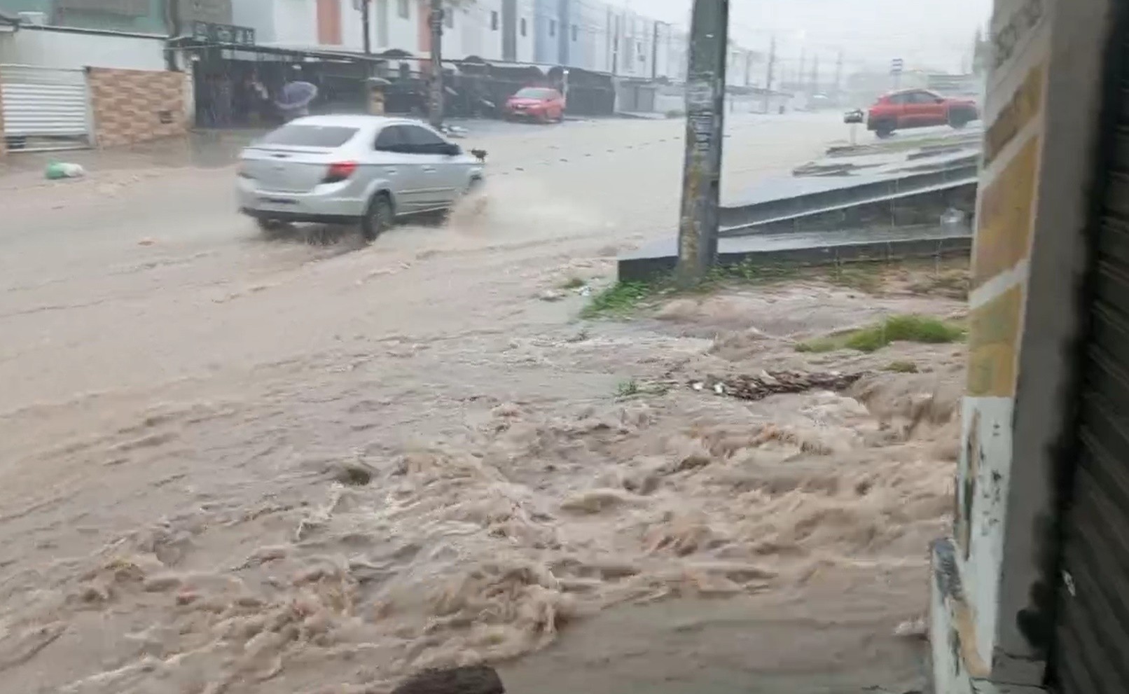 (Foto: Reprodução) Previsão de chuvas de 100 milímetros por dia e ventos intensos, entre 60 km/h e 100 km/h, é válida para algumas cidades até as 10h desta segunda (1º). Fortes chuvas no bairro de Valentina, em João Pessoa, na manhã desta terça-feira (28)